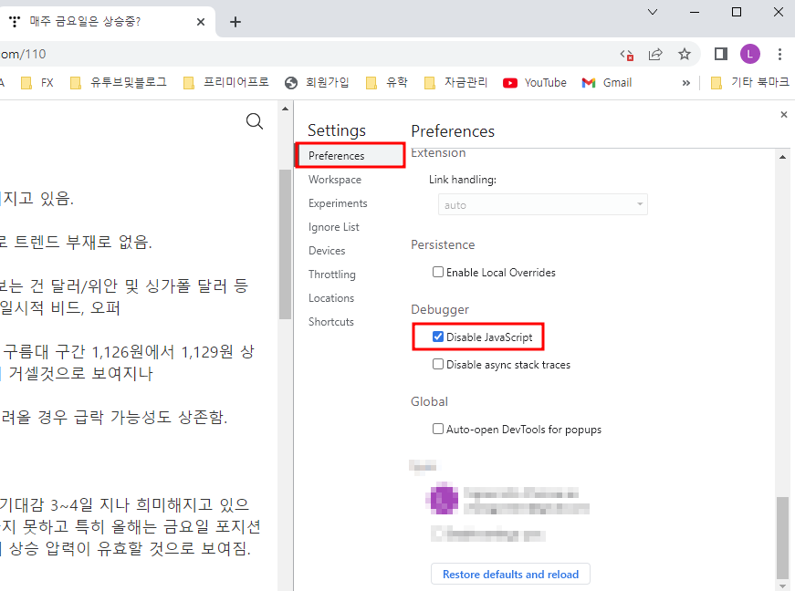 4. Setting에서 Preference 선택 후 아래로 내려오시면 Debugger 카테고리에 Disable JavaScript를 체크해주시면 이제