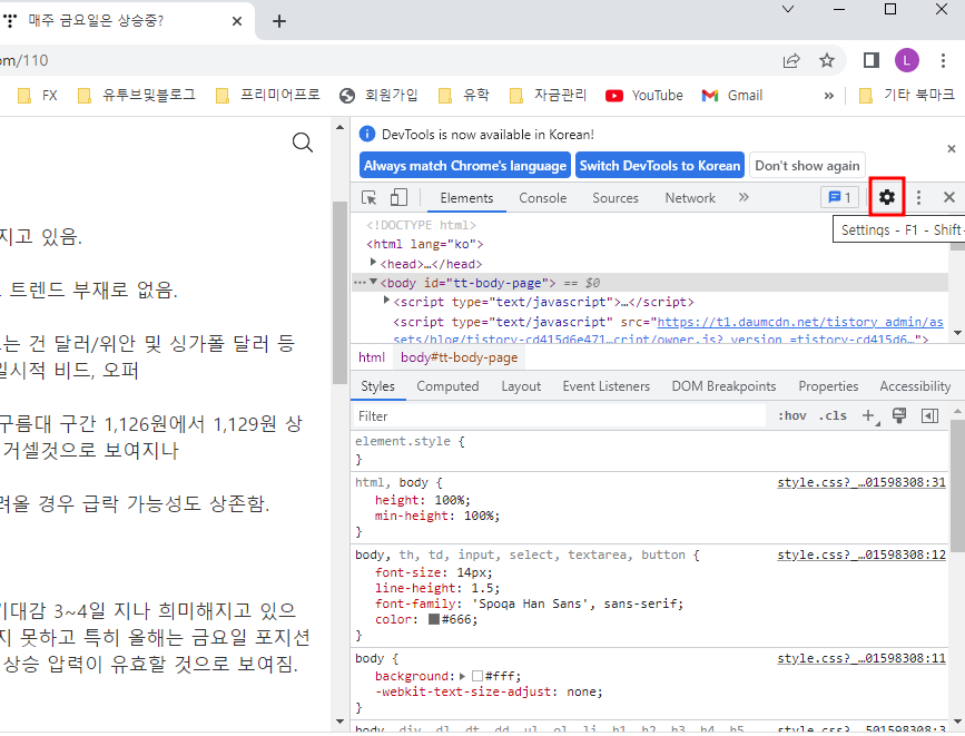 3. 개발자 도구에서 Setting(톱니바퀴)을 선택합니다.